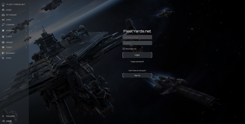 A hangar tool that allows users to view the ships they own in a visually represented grid or in a 3D model top-down view. Users can also connect with friends to form fleets and get a comprehensive view of all ships in the fleet.